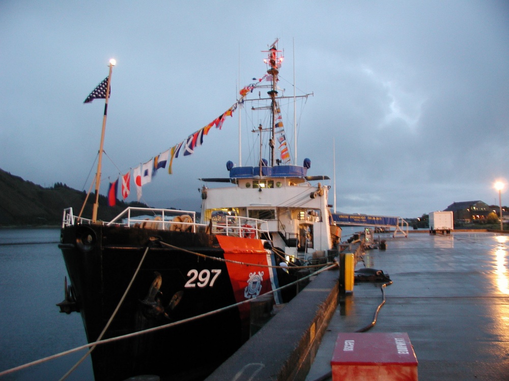 Kodiak, Alaska (Oct. 6 2000)– The Coast Guard Cutter Ironwood sits alongside the pier in Kodiak on the morning of the ships decommissioning. USCG photo by PA1 Keith Alholm.