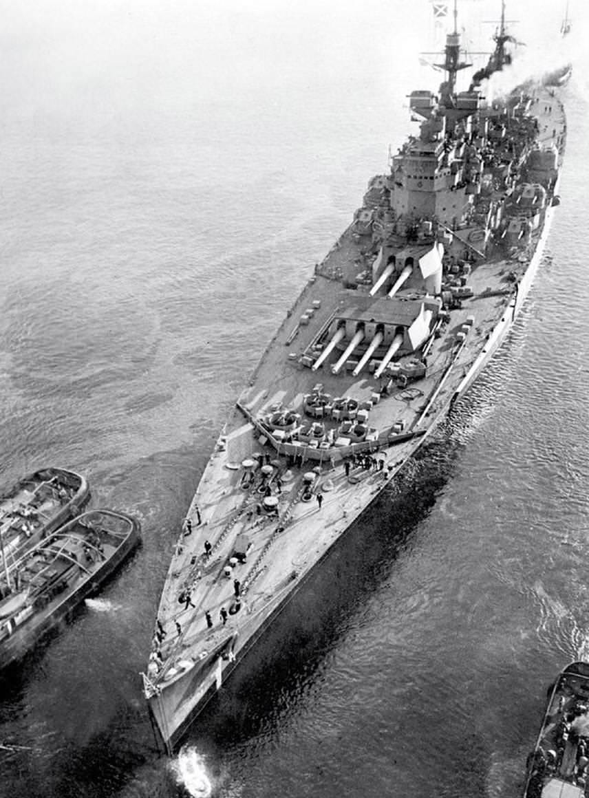 HMS Duke of York (17), showing off her unusual quadruple turret as she departs Rosyth, 1942