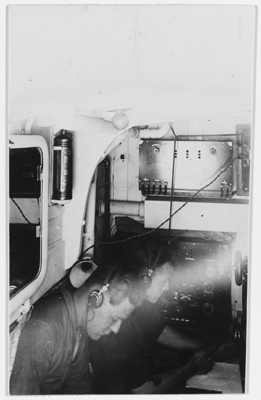 At work aboard a U.S. Navy submarine chaser (SC), at the U.S. Naval Experimental Station, New London, Connecticut, circa 1918. Photo by Louis Harder, New London. NH 2460