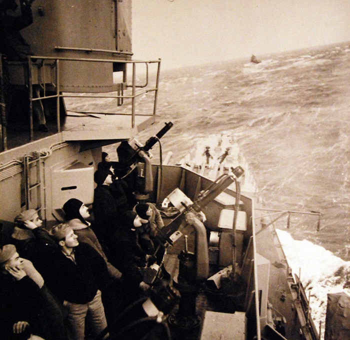 USS Wichita (CA 45) anti-aircraft activity during a North Atlantic Patrol, 1942. She was commissioned with a very light battery of water-cooled .50-cal AAA guns, an armament that was stepped up significantly when she went to the Pacific. 80-G-405273