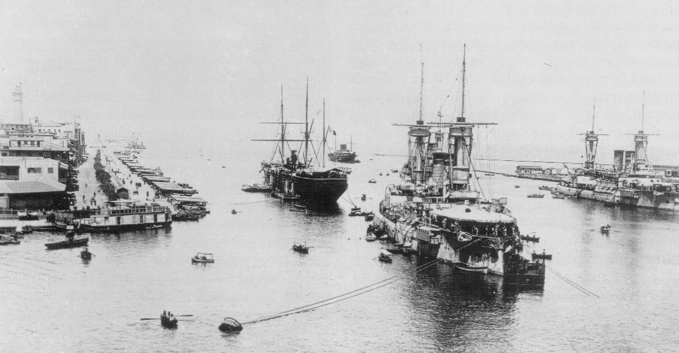 Die deutschen Panzerschiffe SMS Brandenburg (Vordergrund) und SMS Weißenburg (rechts im Bild) im Hafen von Port Said. 1900 Posted on February 12, 2019 by laststandonzombieisland Leave a comment German battleships SMS Brandenburg (foreground) and SMS Weißenburg (in Port Said on the way to China, 1900 Previous Next Return to Warship Wednesday, Feb. 13, 2019: That time the Japanese (briefly) won a condemned (but free) secondhand battleship