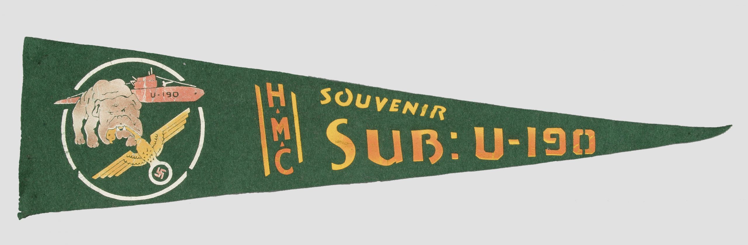 Marked “HMC Sub U-190,” for “His Majesty’s Canadian Submarine,” the pennant graphically marked the new ownership of the surrendered submarine, with a bulldog seizing a Nazi eagle by the neck. CWM 19760322-001