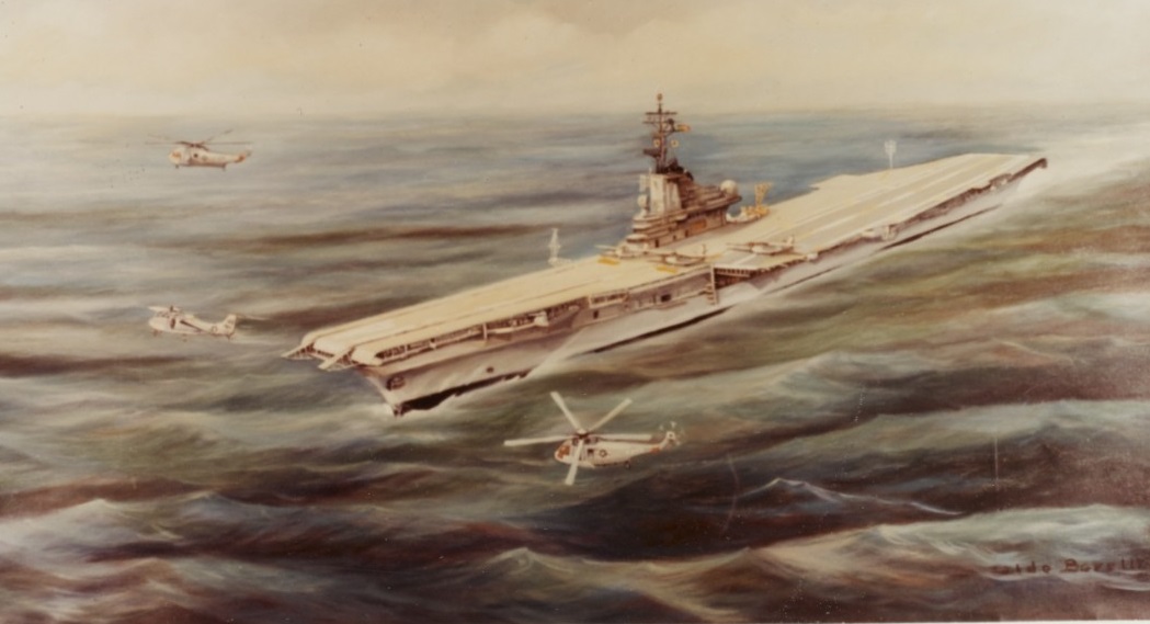 USS TICONDEROGA (CVS-14) Port side view showing the launching of S-2 and SH-3 units of HELISUPRON-1. NH 78896-KN