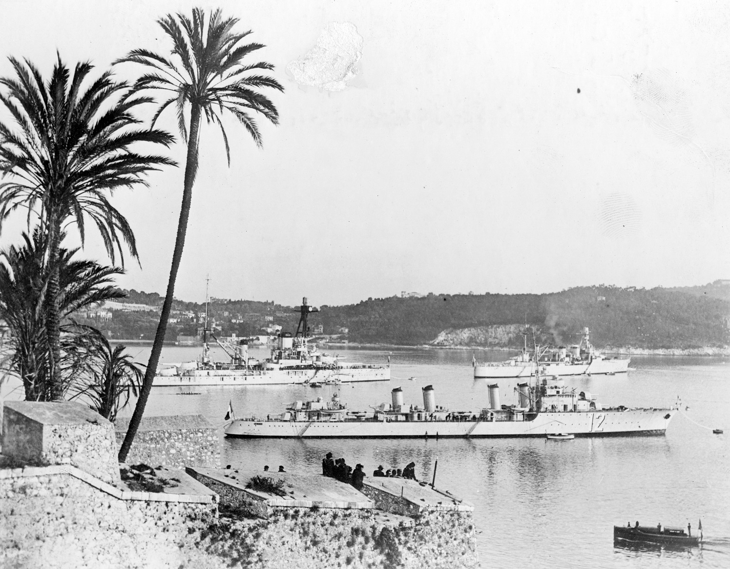 NH 110742 French Warships in port, circa 1939 Mediterranean palm trees and old fort 2400-tonne type destroyer battleship Courbet, while a Duguay Trouin class light cruiser is to the right
