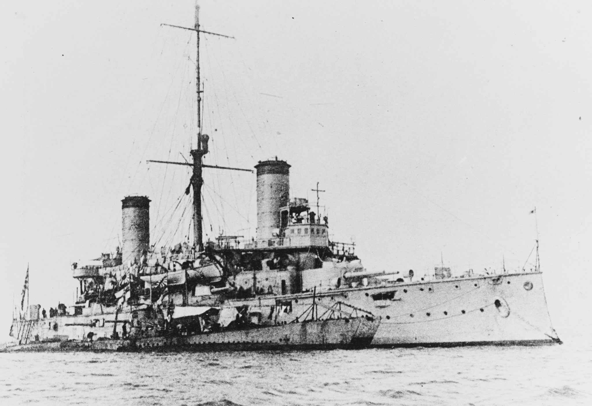 Nisshin, photographed in 1918-19, with the ex-German submarines O-4 (ex-UC-90) and O-5 (ex-UC-99) alongside. NH 58666