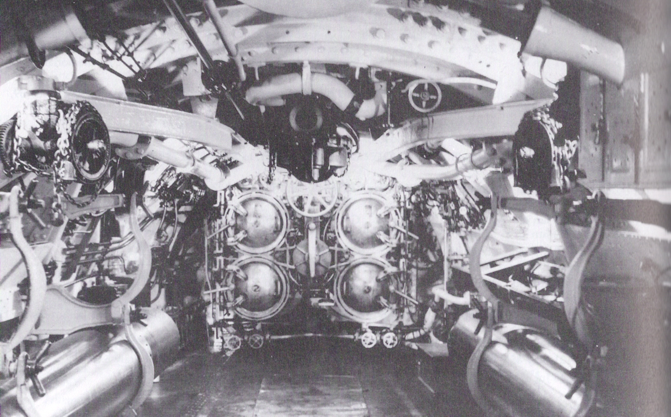 torpedo room of USS H-5 in 1919. The breeches of the four 18-inch (457 mm) torpedo tubes