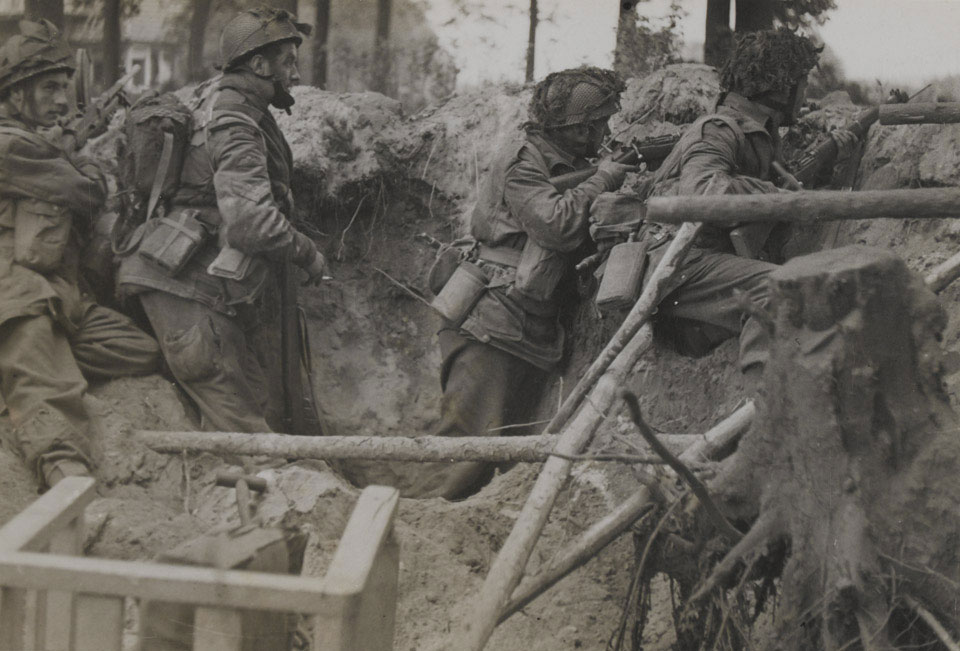 British 1st Airborne Division take cover in a shell hole, Arnhem, 17 September 1944 SMLE BREN STEN NAM. 2005-12-38-72