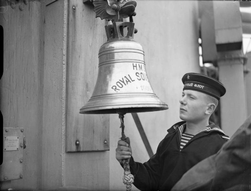 A Russian rating sounding the bell of HMS ROYAL SOVEREIGN (after being passed to the Soviet Navy and renamed ARCHANGELSK). IWM A23811