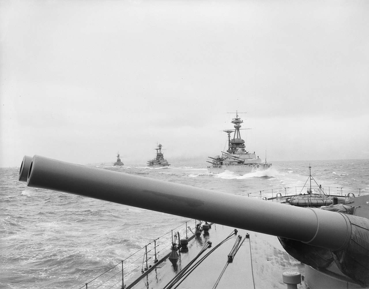 British battleships HMS Revenge, HMS Resolution and HMS Royal Sovereign of the 1st Battle Squadron at sea. IWM Q18123