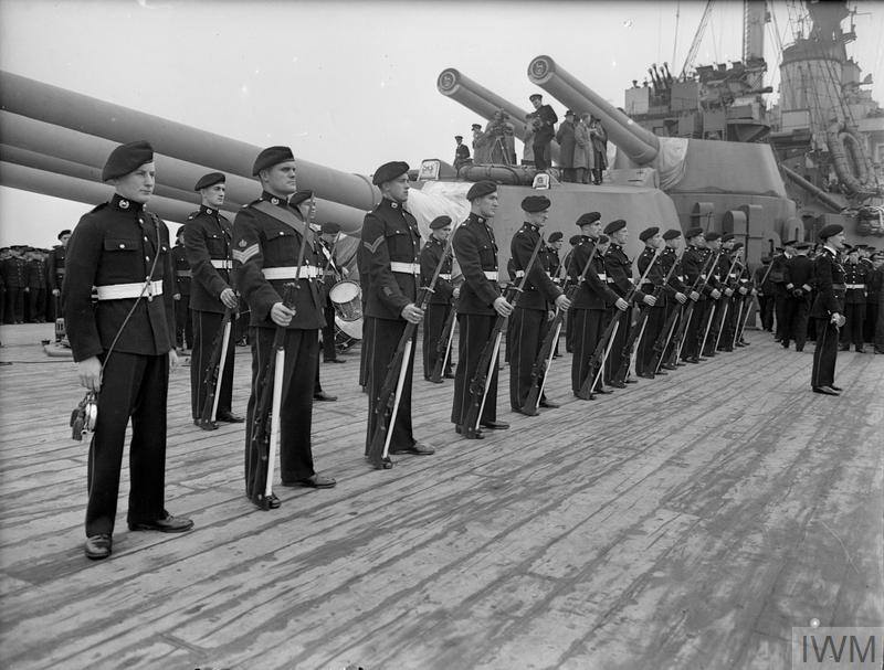 Royal Marines honor guard transfeer ceremony of HMS ROYAL SOVEREIGN. She served in the Soviet Navy as ARCHANGELSK 31 May 1944 Rosyth