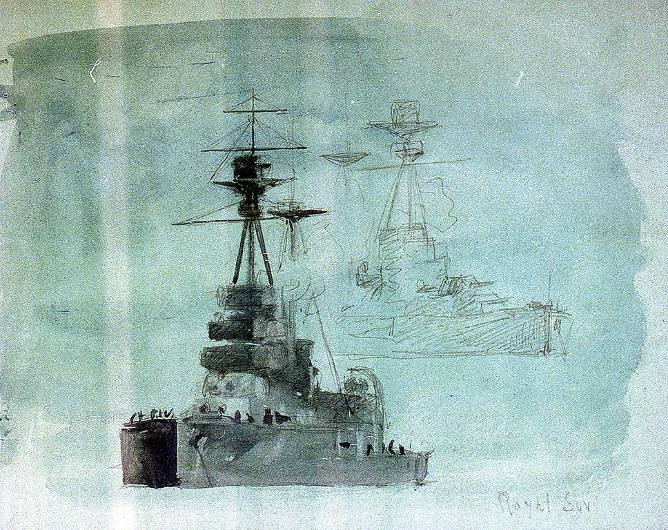 Inscribed by the artist, lower right. ‘R Sov’. Two loose studies of the battleship ‘Royal Sovereign’, built at Portsmouth Dockyard, launched on 29 April 1915 and completed in May 1916. These sketches of her at anchor show her rig as completed and were probably made in 1916-17. The main wash drawing is a view from off the port bow: the slighter pencil sketch takes practically the same angle from off the starboard bow. The paper has a blue-grey tint and has been given a wash of blue-green watercolor over which the rest is worked. http://collections.rmg.co.uk/collections/objects/116841 RMG PV2691