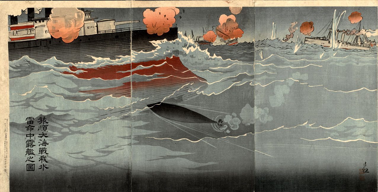 Illustration of Our Torpedo Hitting Russian Ship at Great Naval Battle of Port Arthur” by Kobayashi Kiyochika, 1904