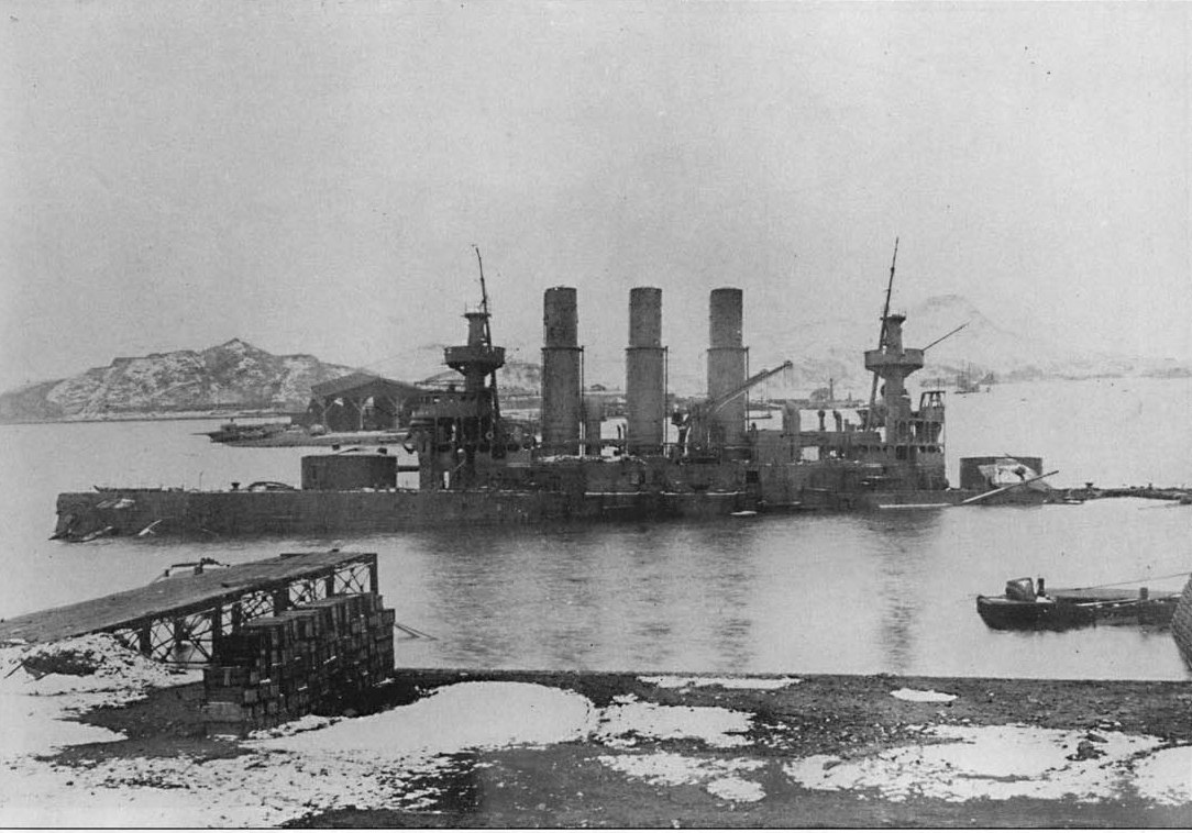 Port Arthur 1905 Russian battleship Retvizan sunk by Japanese 11 inch howitzers shallow water