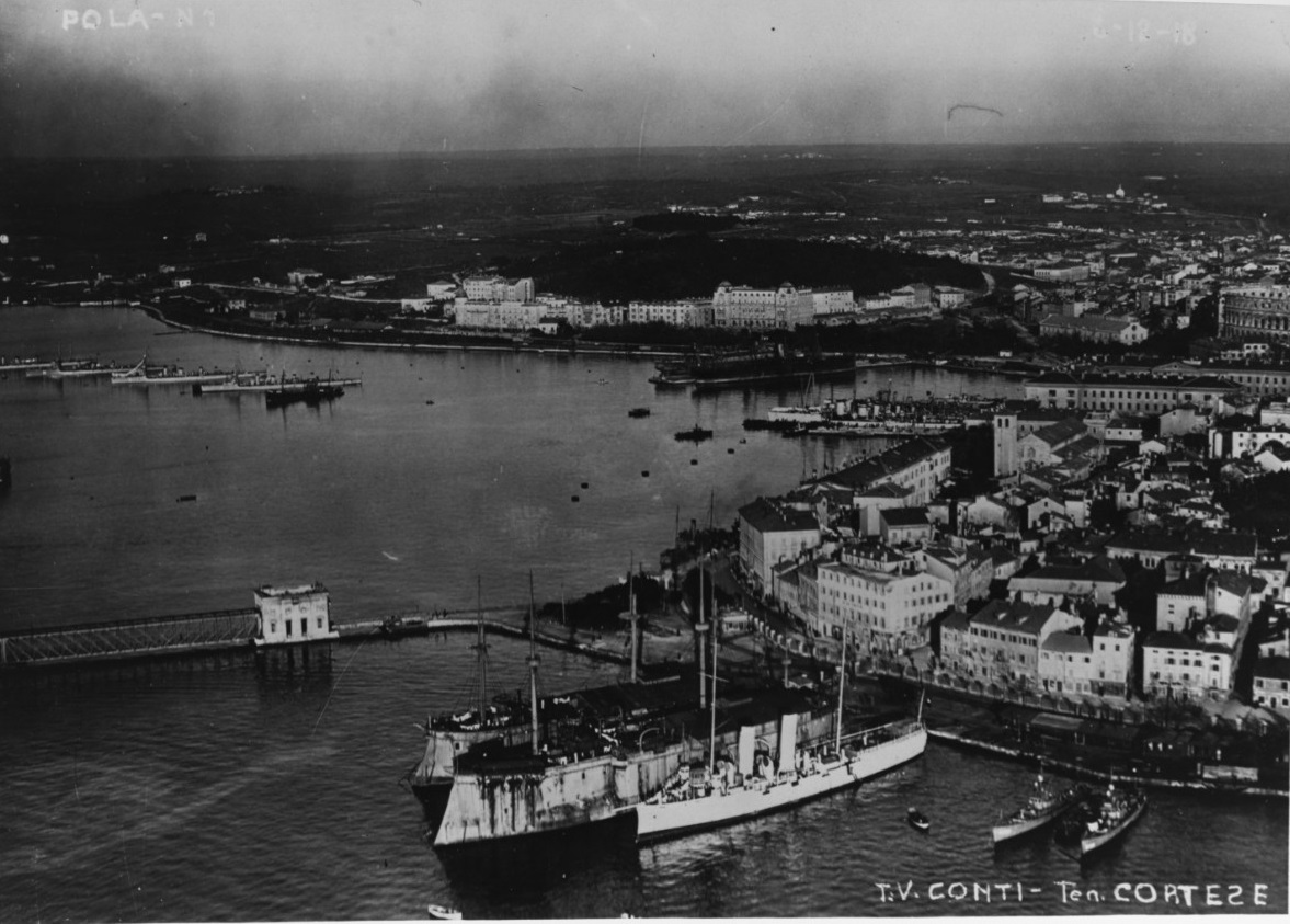 Pola Harbor, Yugoslavia in the foreground are three ex-Austrian hulks: front to back, LACROMA (ex-TIGER, 1887-1920), CUSTOZZA (1872-1920), and BELLONA (ex-KAISER, 1872-1920). To their right are two US SC boats. In the upper left are four French ALGERIEN class destroyers: bow letters I, H, Q, and R. In the center are three Italian destroyers including one of the ALESSANDRO POERIO class. Photo taken late 1919-early 1920. Description: Courtesy of Paul H. Silverstone, 1983 NH 95006