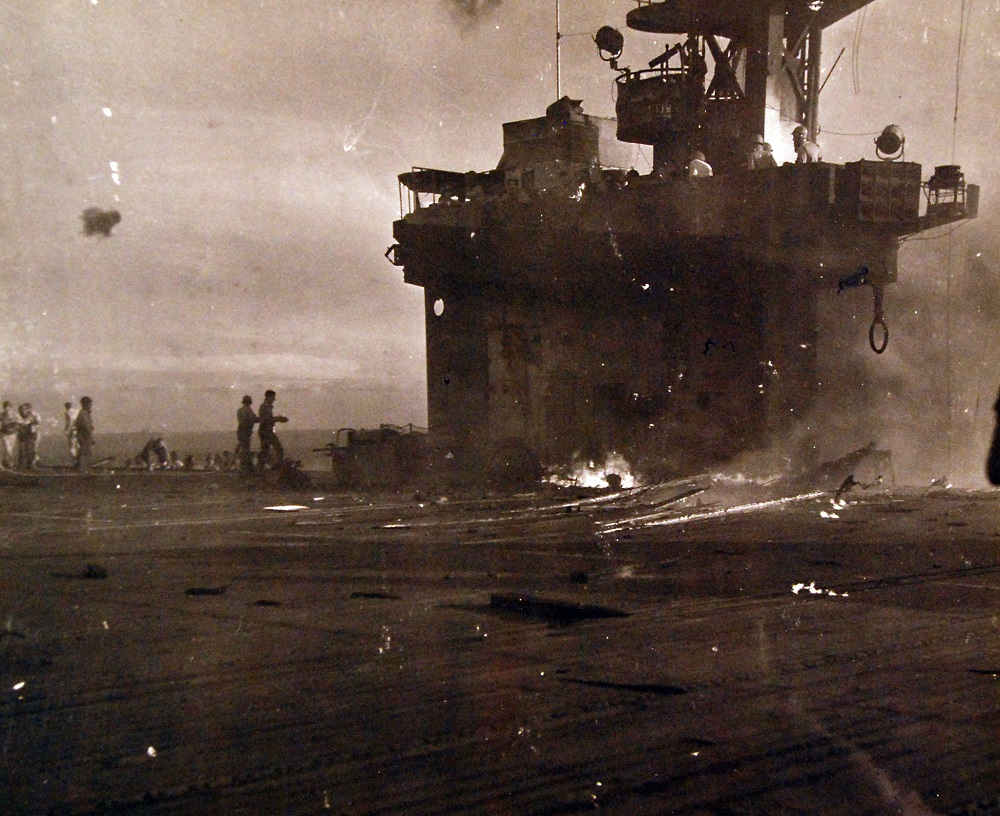 USS Manila Bay (CVE 61). Crew combating fire after Japanese kamikaze crashed into the ship’s flight deck at Luzon, South China Sea, during operations in the support of the invasion of Luzon. Released January 5, 1945. 80-G-273184