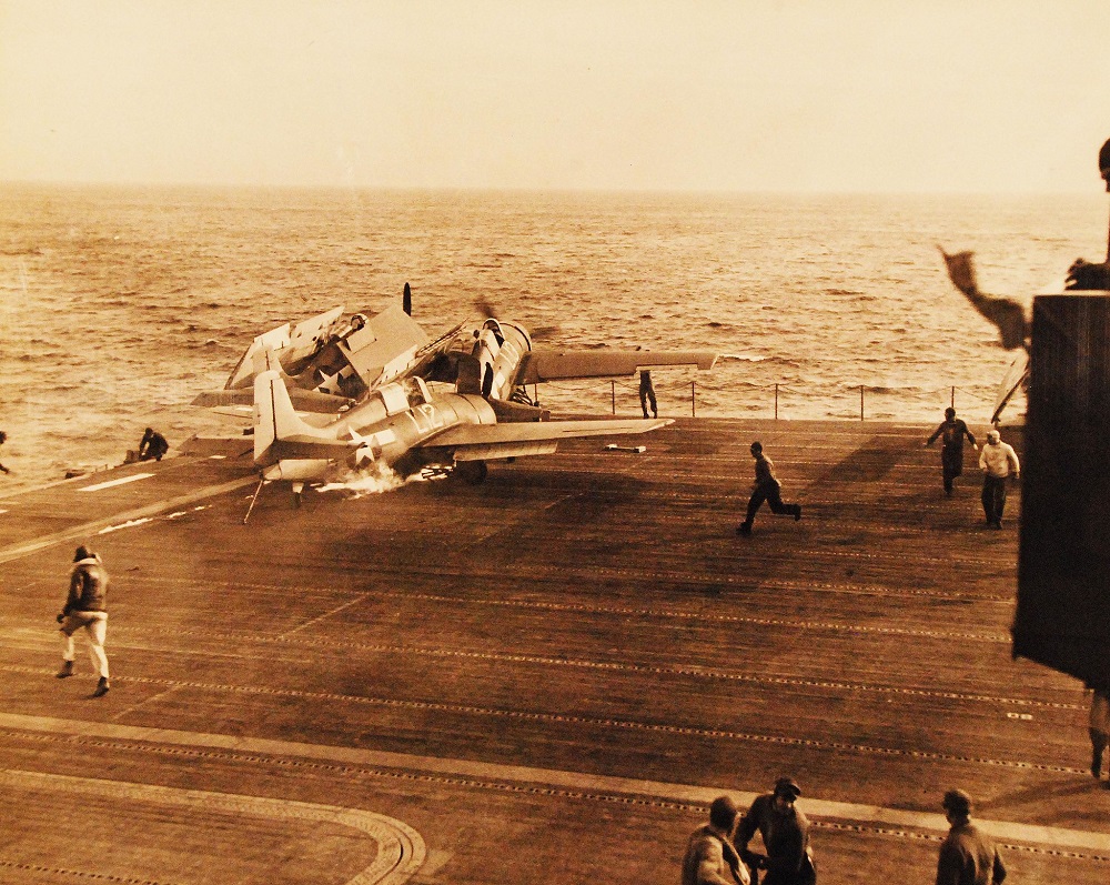 80-G-372821 Posted on March 4, 2020 by laststandonzombieisland Leave a comment Crash of FM1 Wildcat, Bu# 46789, on the flight deck of USS Manila Bay (CVE 61), as she bursts into flames, December 16, 1943. 80-G-372821 Previous Next Return to Warship Wednesday, March 4, 2020: The Saipan Jug Carrier