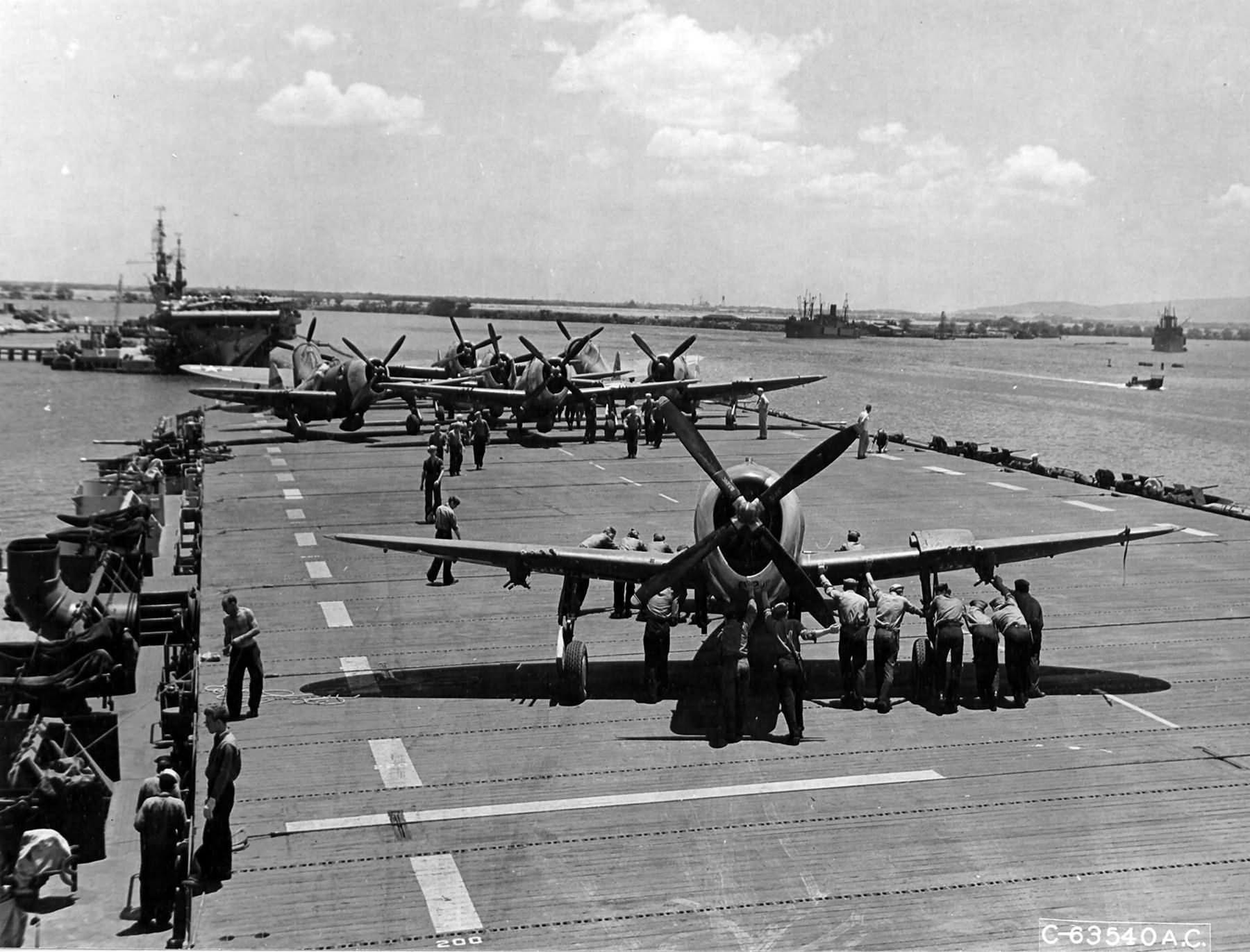 P-47D serial 43-25402 “Smokepole” of the 19th FS, 318th FG on the flight deck of aircraft carrier.