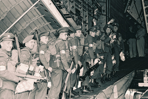 Irish Defence Forces personnel boarding a US Globemaster transport aircraft for the Congo in the early 1960s armed with the Lee Enfield No. 4 Mk 2, Bren and Swedish Carl Gustaf m45.