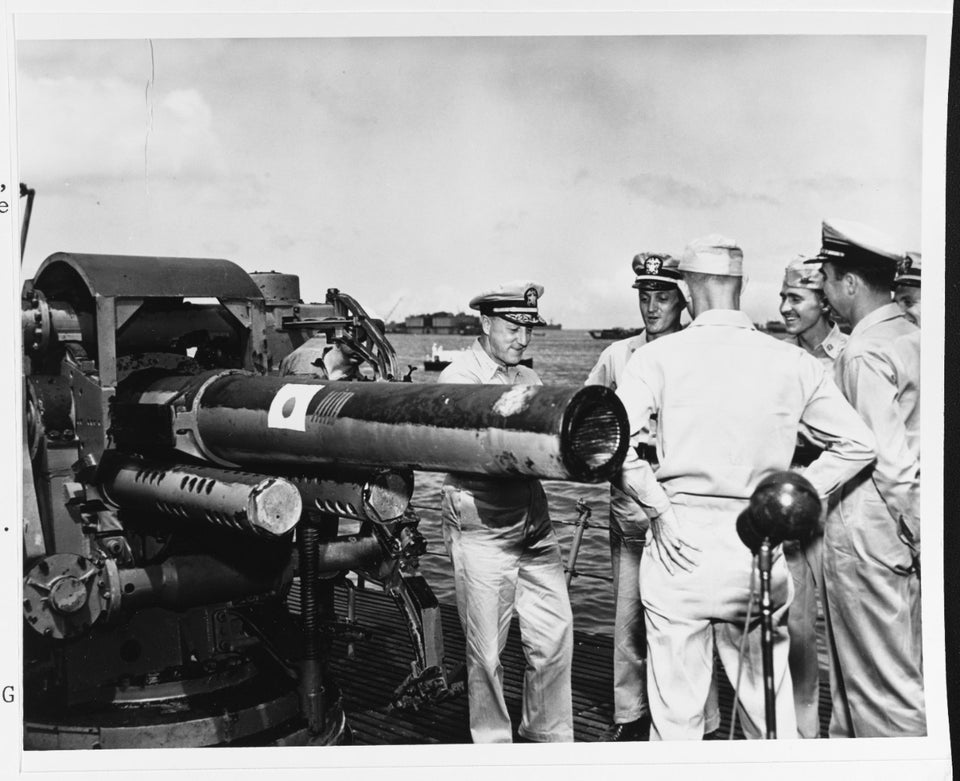 5in 25 deck gun USS Balao (SS-285), 1945. COMSUBPAC Vice Admiral Lockwood Guam
