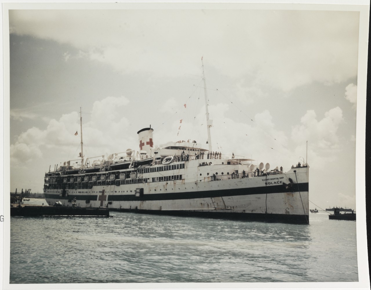 U.S. Navy Hospital Ship USS SOLACE (AH-5) arrives from Guam, 4 June 1945, bringing casualties from Okinawa. She made three evacuation trips from Iwo Jima to base hospitals at Guam and Saipan, carrying almost 2,000 patients, and seven trips from Okinawa. Photograph by PhoM2c J.G. Mull. 80-G-K-5631