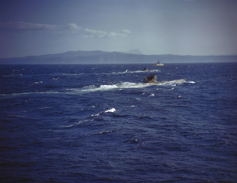 Thetford Mines, background, escorting surrendered U-boats, May 1945. LAC Kodachrome WO-A037319