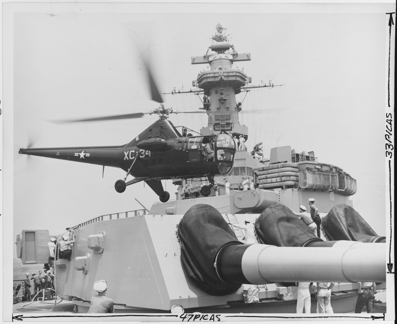 Sikorsky HO3S-1 helicopter (Bureau # 122527) landing on the forward 16-inch gun turret, during the 1948 Midshipmen’s cruise. Guard mail, ships’ newspapers and personnel were exchanged via helicopter while the Midshipmen’s cruise squadron was at sea. Most exchanges were made by hovering pick-up. The forward turret was used as a landing platform since the floatplane catapults on the ship’s fantail prevented helicopters from operating there. Photo was filed 13 September 1948. Official U.S. Navy Photograph, now in the collections of the National Archives. Catalog #: 80-G-706093