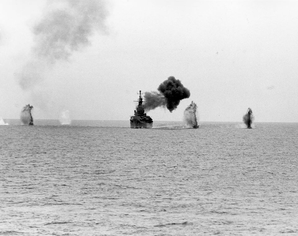 USS St. Paul (CA 73) fires at the Cong Phu railroad yard as it is bracketed by North Vietnamese shells in this August 1967 photo