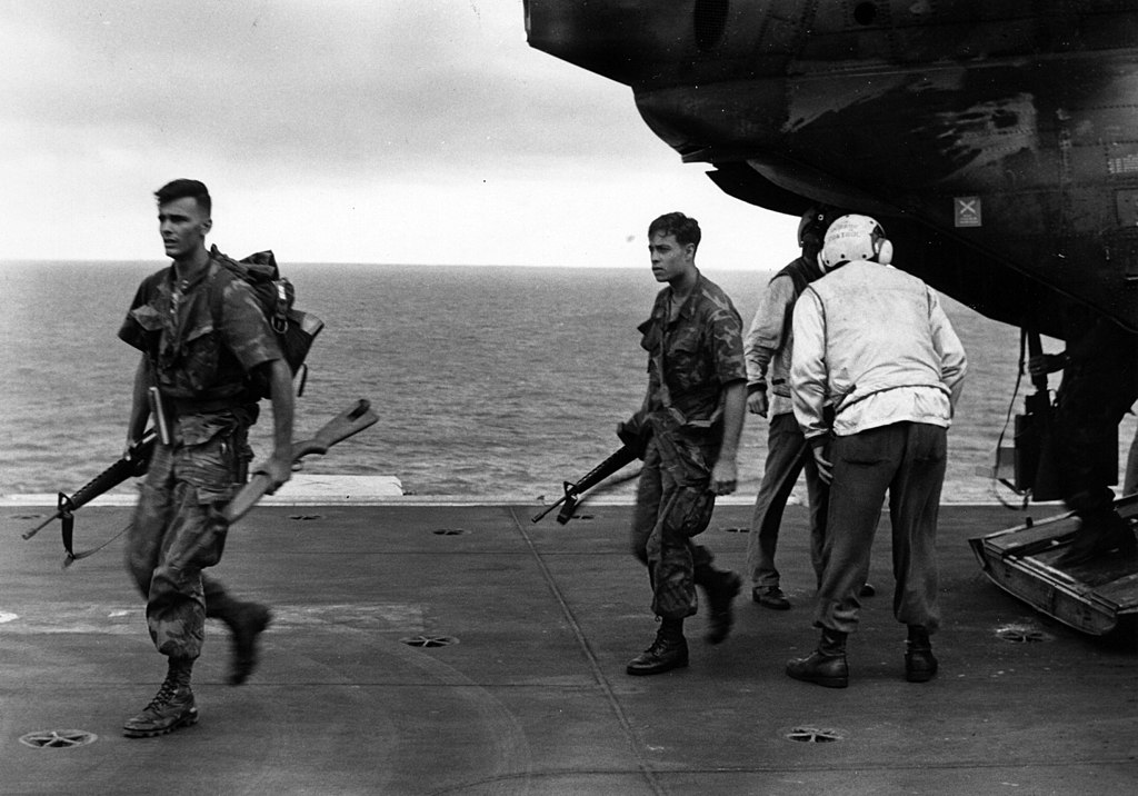 The last members of the Marine Security Guard land on USS Okinawa USMC 30 April 1975 Posted on April 29, 2020 by laststandonzombieisland Leave a comment The last members of the Marine Security Guard land on USS Okinawa USMC Photo by GySgt Russ Thurman Previous Return to Last minutes of Saigon, 45 Years Ago today
