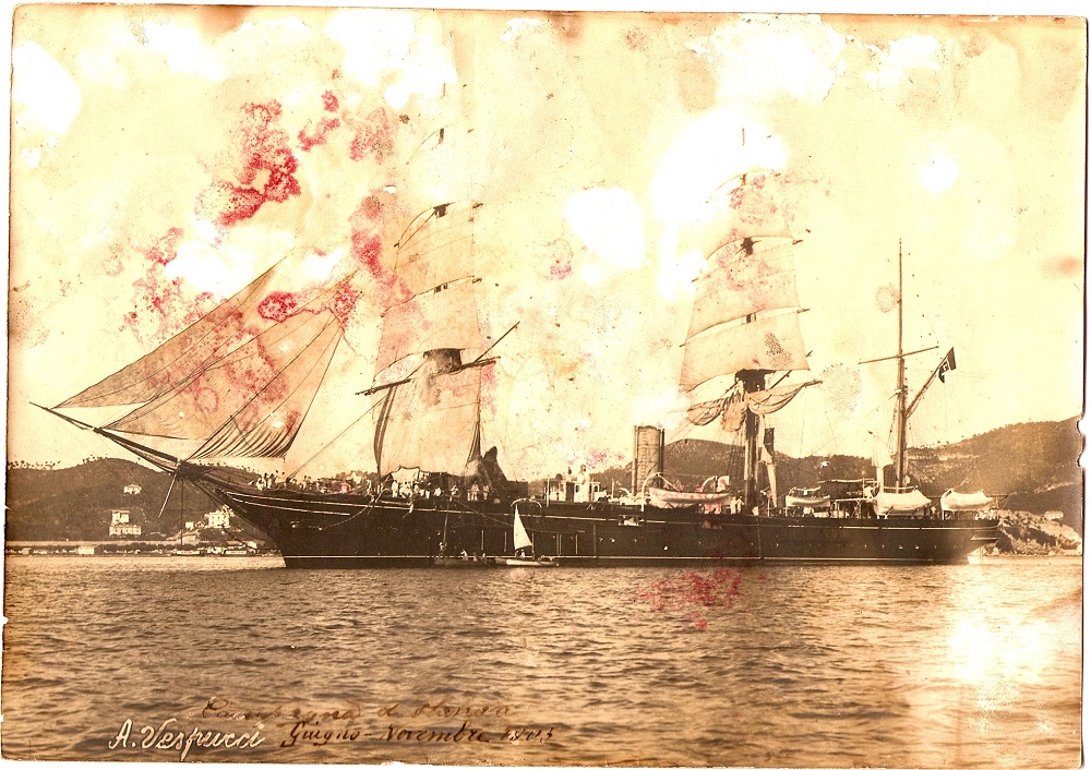 The Regia Marina’s first Amerigo Vespucci, shown here in 1903 while ranked as a corvette, served from 1882 until 1928, first as the fleet flagship, then a solid 26-years as a training ship for the students of the Royal Naval Academy, the Accademia Navale in Livorno.