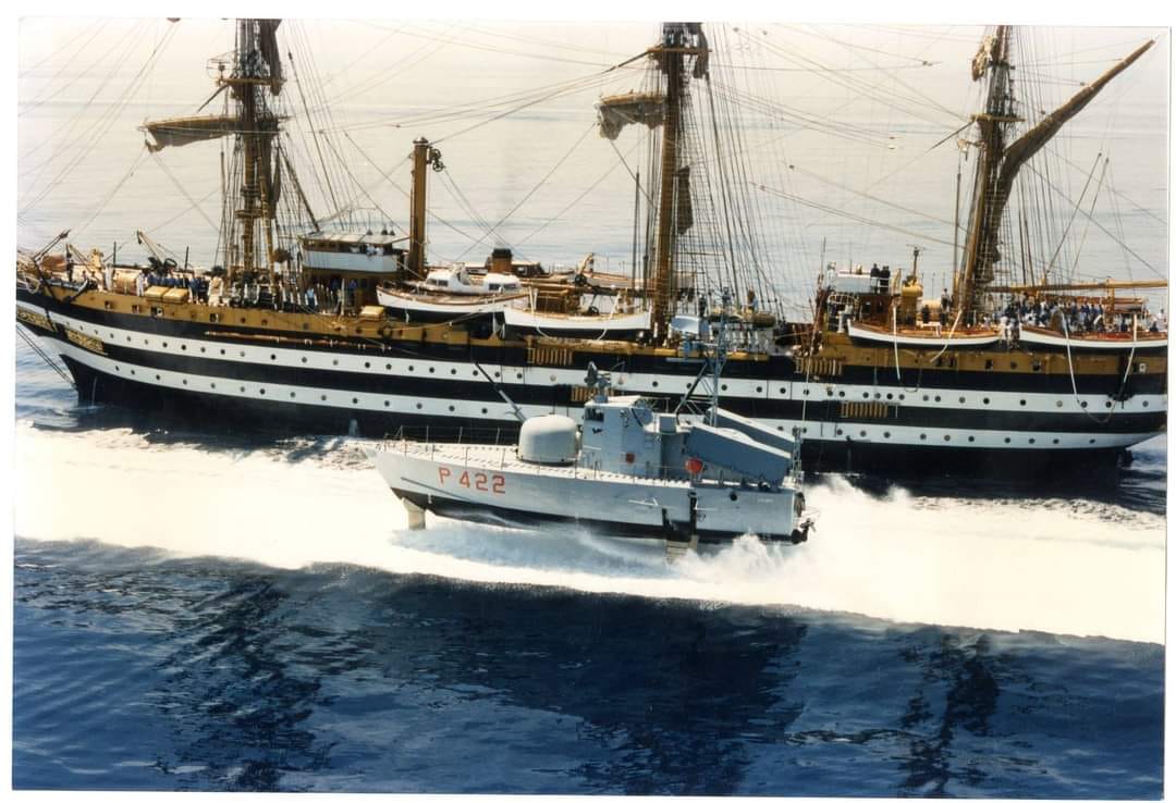 Amerigo alongside one of the Italian navy’s exotic Sparviero-class hydrofoils. Talk about old meets new…