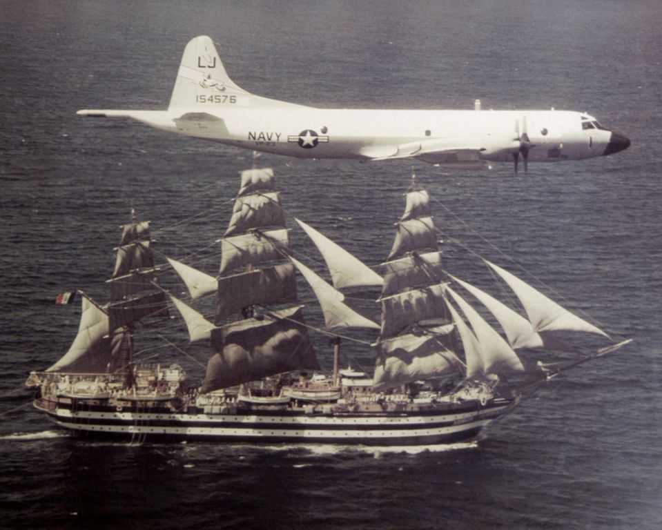 A U.S. Navy Lockheed P-3B-95-LO Orion (BuNo 154576) from Patrol Squadron VP-23 Seahawks flying over the Italian Naval Academy sailing ship Amerigo Vespucci in 1976. The P-3B 154576 was later sold to Norway. U.S. Navy photo by PH1 R.W. Beno, U.S. Navy. U.S. Navy National Museum of Naval Aviation No. 2004.nai.055.001
