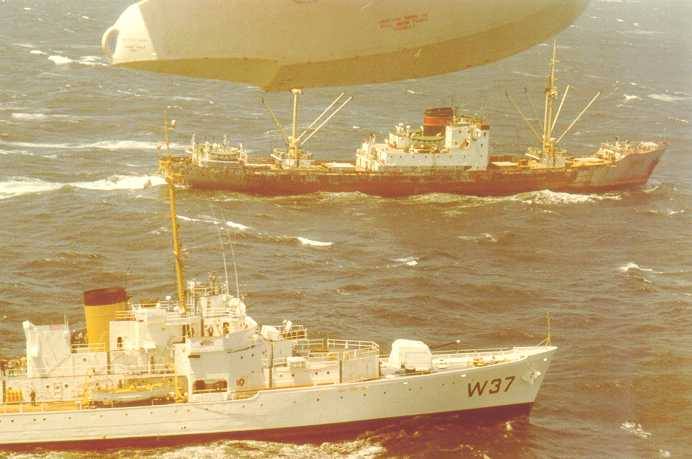 Taney maintains surveillance of the Soviet refrigerator vessel Chernjakhovsk off northern California in May of 1965.