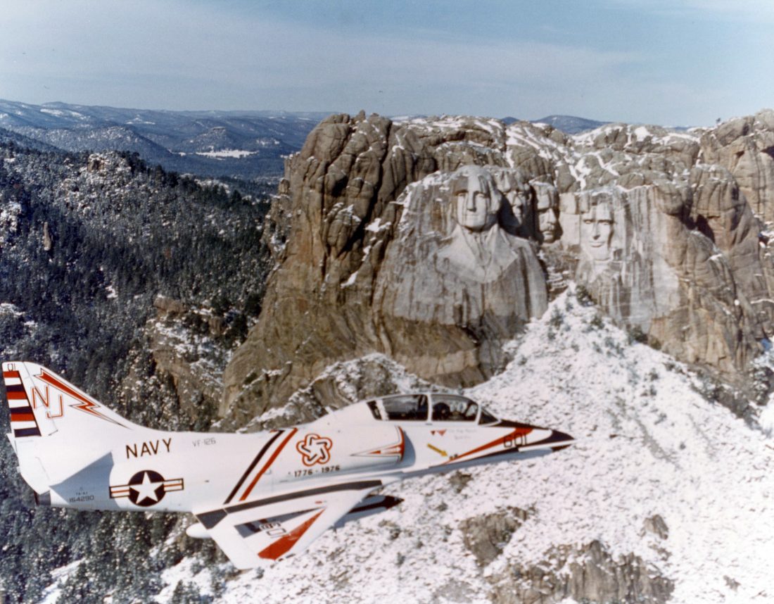 Bicentennial Douglas TA-4J Skyhawk BuNo 154290 VF-126 speeds past Mt. Rushmore South Dakota circa March 1976. This photo was published on the front page of the LA Times, as well as other major regional newspapers, the last week of May 1976