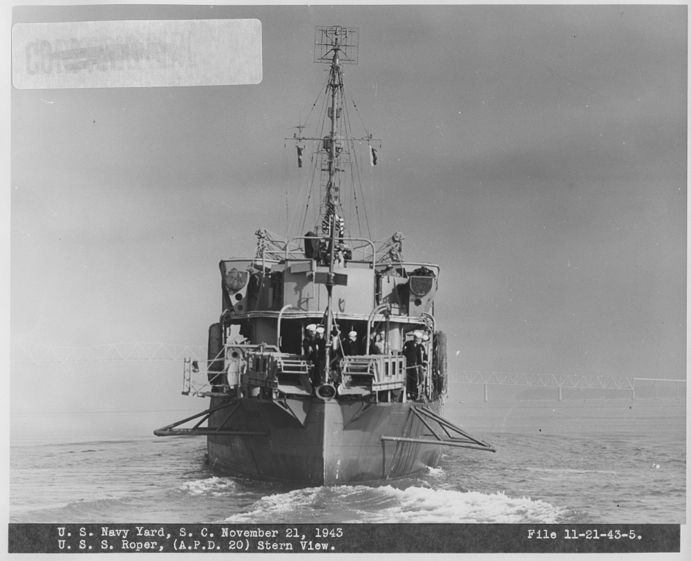 US Navy Yard, SC, November 21, 1943. USS Roper, (APD-20) Stern View. File 11-21-43-5. Patriots Point Naval and Maritime Museum