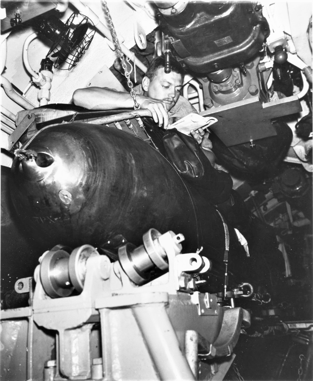 80-G-49457 Posted on August 5, 2020 by laststandonzombieisland Leave a comment Crewman reading in his bunk, atop a torpedo loading rack in one of the submarine’s torpedo rooms. Note the small fan in the upper left. 80-G-49457 Previous Next Return to Warship Wednesday, Aug 5, 2020: Number 52