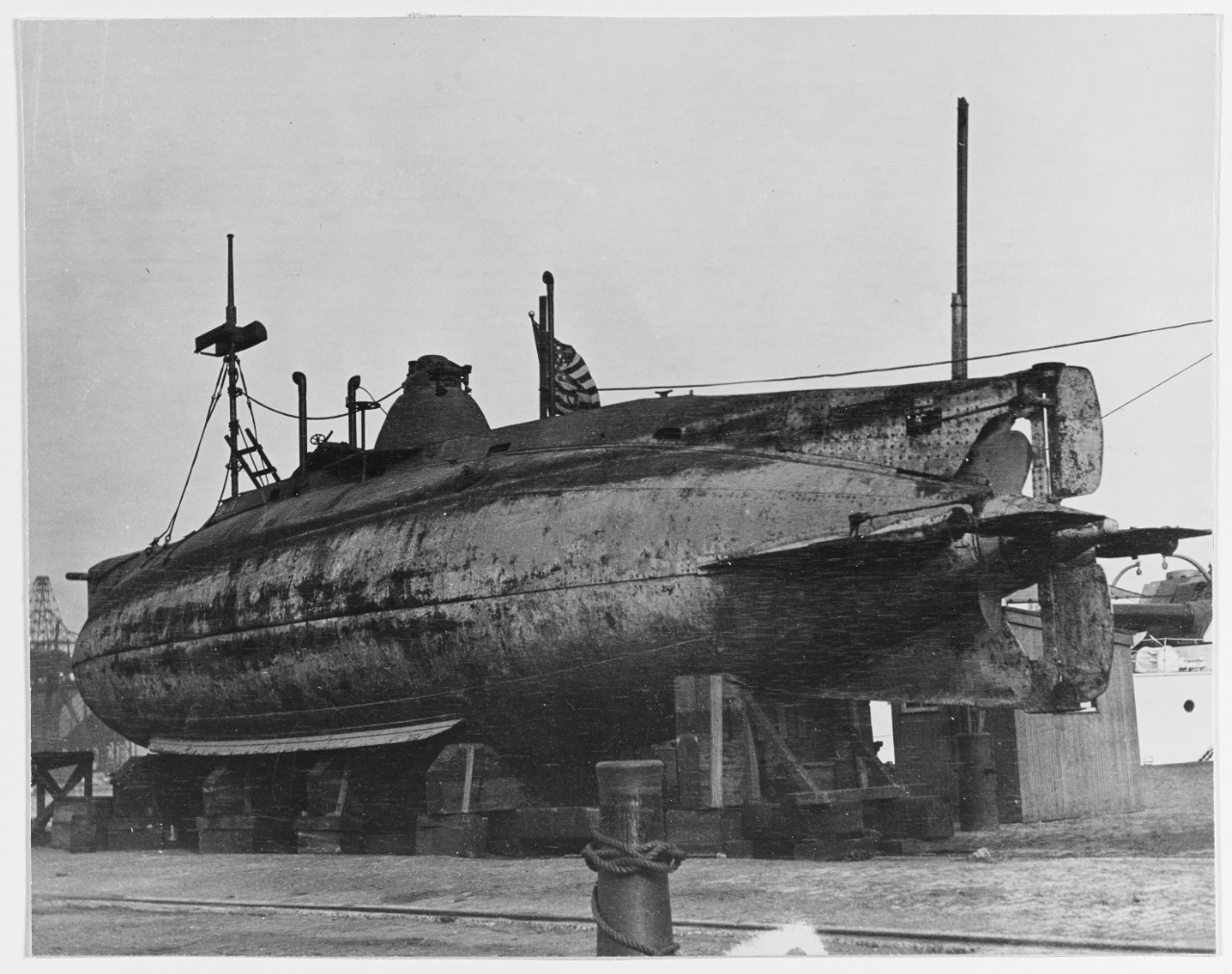 USS Plunger (Submarine # 2) Hauled out of the water, during the early 1900s. Note the bollard in the foreground, made from an old muzzle-loading cannon. Courtesy of the Electric Boat Company, Groton, NH 42622