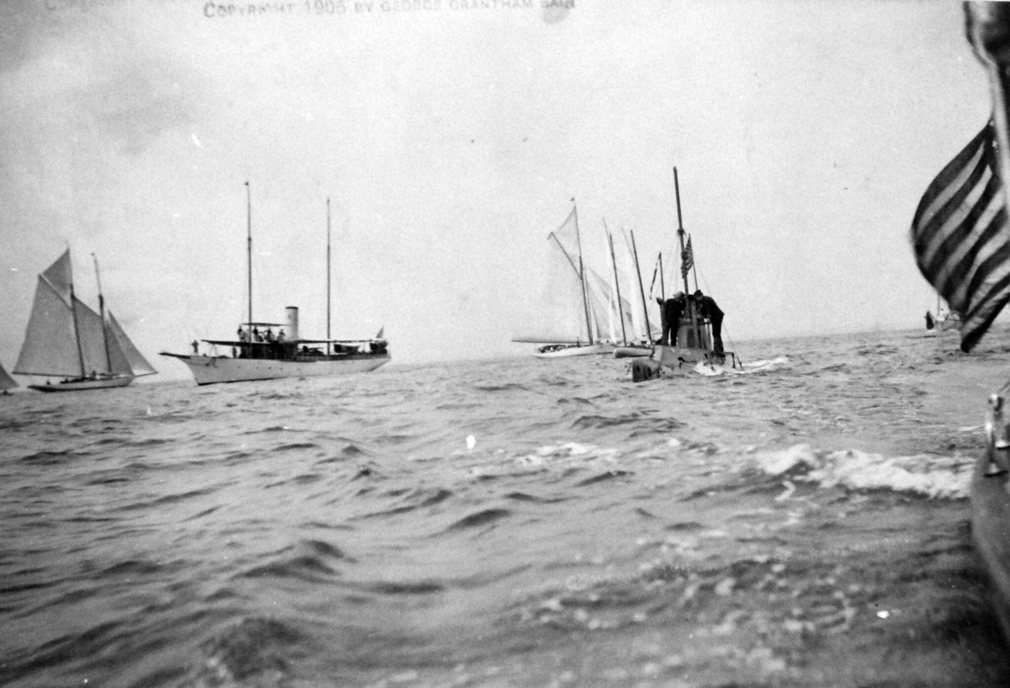 USS Plunger (Submarine #2, later A-1), with crew on deck, August 30, 1905. USS Slyph to the left. George Bain Collection