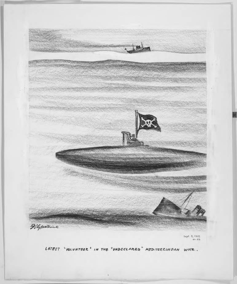 “Latest volunteer in the undeclared Mediterranean War” by Daniel Fitzpatrick, lampooning the Italian pirate submarines in the Spain Civil War. St. Louis Post-Dispatch, St. Louis, Missouri, 5 Sept 1937. Via The State Historical Society of Missouri https://cdm17228.contentdm.oclc.org/digital/collection/ec/id/11937