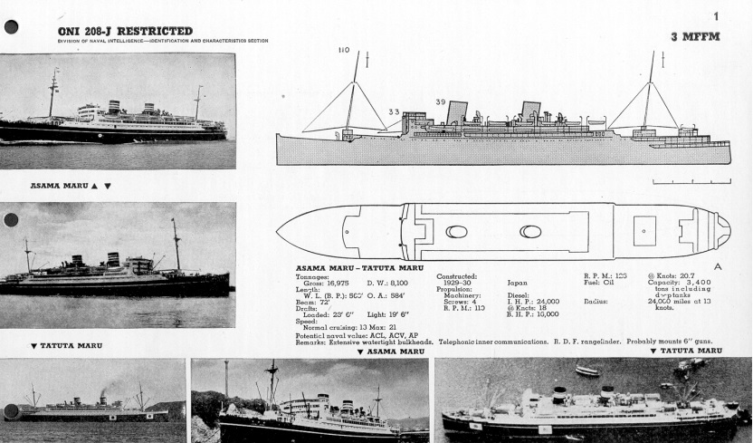 Asama Maru and her sisters were literally page no. 1 in ONI 208J “Japanese Merchant Vessels,” hinting at how big a prize she was for American sub skippers.