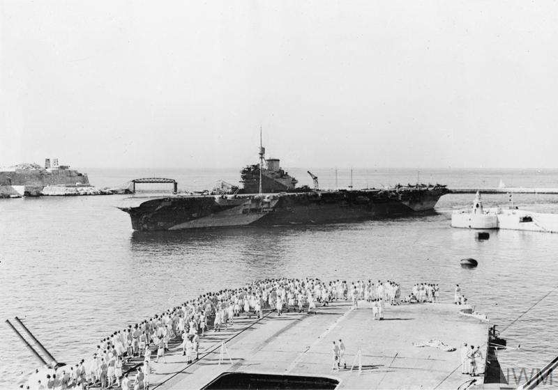 BIG SHIPS AT MALTA. OCTOBER 1943, ON BOARD HMS FORMIDABLE AT GRAND HARBOUR, VALLETTA, MALTA. (A 19815) The aircraft carrier HMS ILLUSTRIOUS steams into Grand Harbour, as men line the flight deck of HMS FORMIDABLE to watch her progress. Copyright: © IWM. Original Source: http://www.iwm.org.uk/collections/item/object/205152374