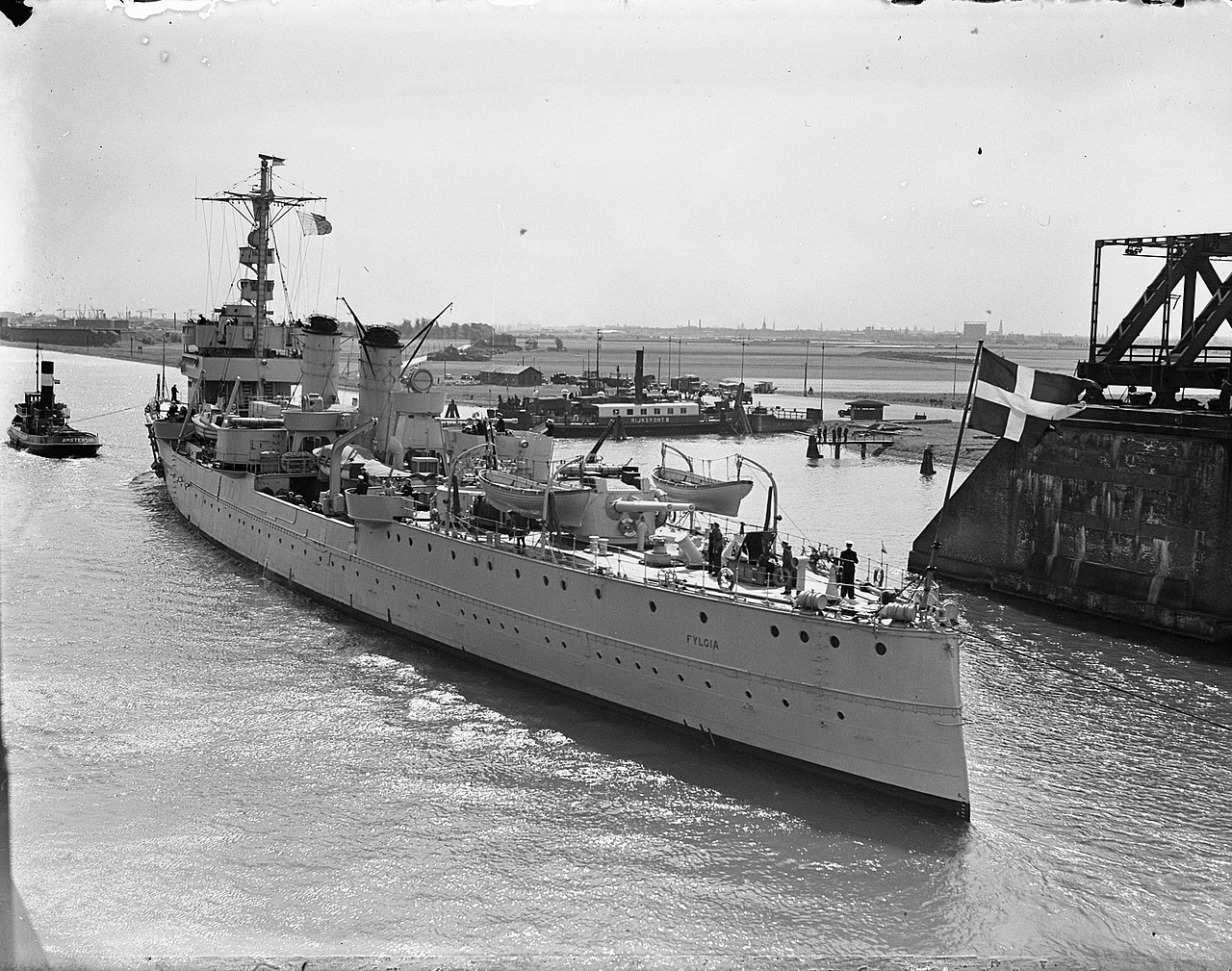 Fylgia passing the Hembrug bridge across the North Sea Canal headed to Amsterdam, 28 May 1948, Dutch Nationaal Archief 902-7703. Note some of her wartime AAA guns have been stripped but her long-barreled 6-inchers remain aboard.