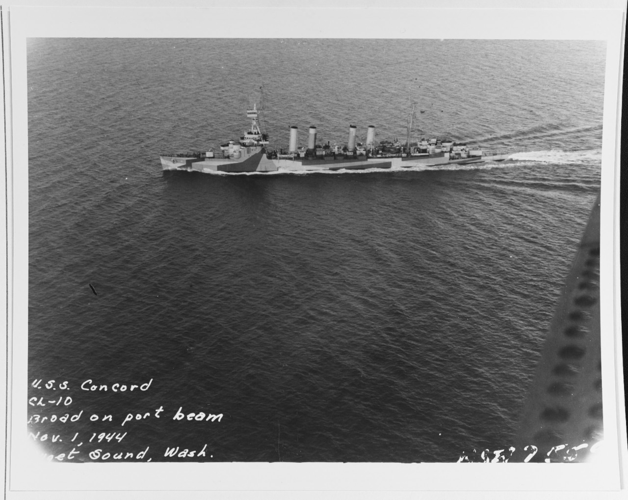USS Concord (CL-10) Underway in Puget Sound, Washington, 1 November 1944. Her camouflage is Measure 33, Design 2f. Photograph from the Bureau of Ships Collection in the U.S. National Archives. Catalog #: 19-N-75591
