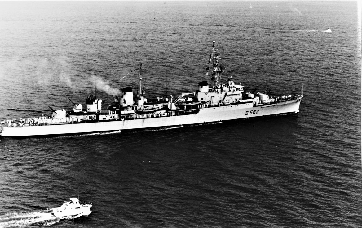 SAN GIORGIO (D 562), Italian DL, in New York Harbor for the International Naval Review, 4 July 1976. Originally laid down as a Roman Captain-class light cruiser in WWII, by 1965 she was a training ship that took summer midshipmen cruises around the globe– replicating her namesake’s 1920s and 1930s mission. She was retired in 1979 and sold to the breakers in 1987. K-114252