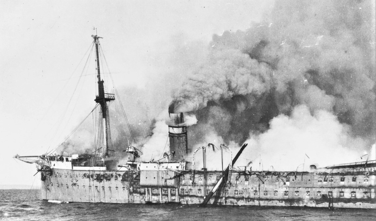 Vinh-Long aflame from stem to stern in the Sea of Marmora near Constantinople, Turkey, in the morning of 16 December 1922. This view was taken from USS Bainbridge (DD-246), soon after she had removed Vinh-Long’s survivors. Note that the transport’s mainmast has fallen overboard, the result of a series of explosions that spread flames into the forward part of the ship. Catalog #: 19-N-11576