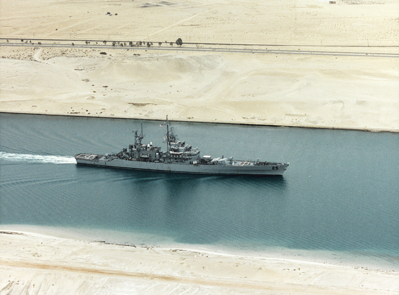 USS Bainbridge (CGN-25) Underway in the Suez Canal on 27 February 1992, while en route to the Mediterranean Sea with the USS Dwight D. Eisenhower (CVN-69) battle group. Photographed by CWO2 A.A. Alleyne, USN. Official U.S. Navy Photograph, from the Collections of the Naval History and Heritage Command.