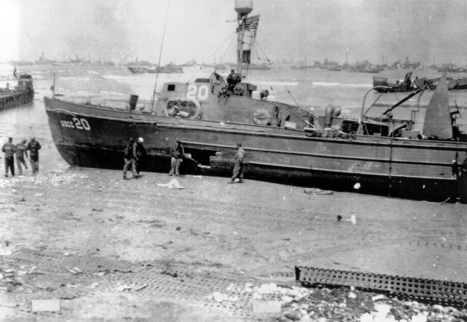 USCG 20 was driven ashore in Normandy during the storm that destroyed the artificial Mulberry harbors in June 1944. She was later repaired and transferred to the Royal Navy.