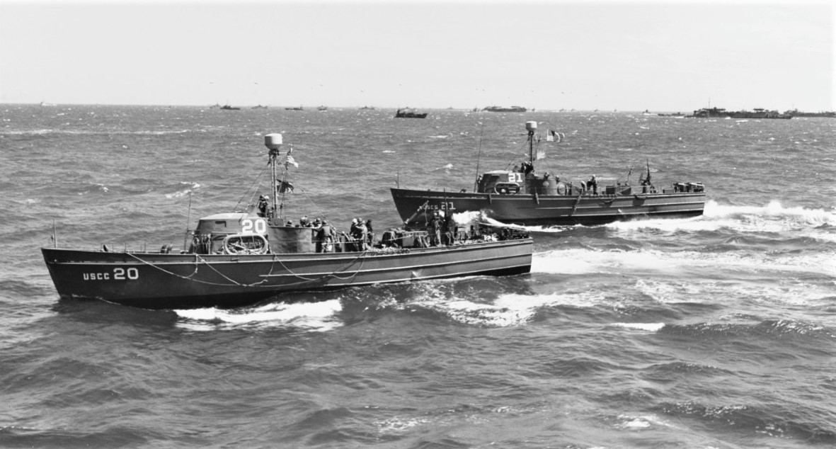 Two U.S. Coast Guard 83-foot patrol boats operating off the Normandy beaches as rescue craft, in June 1944. They are USCG-20 (83401) and USCG-21 (83402). 26-G-3743