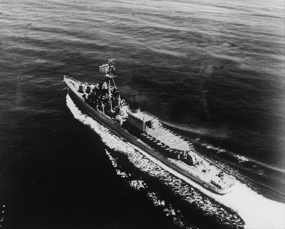 “U.S. Navy’s First Helicopter Destroyer Conducts Exercises. USS Hazelwood is the Navy’s first anti-submarine helicopter destroyer, steams off the Atlantic coast near Newport, Rhode Island. Attached to Destroyer Development Group Two, Hazelwood is undergoing extensive training exercises to acquaint her crew with air operations. Her flight deck is designed to accommodate the DSN-1 Drone Helicopter (QH-50) scheduled for delivery from Gyrodyne Company of America, Inc. Soon, an HTK Drone Helicopter with a safety pilot, developed by the Kaman Aircraft Company, is being used for training exercises until the DSN-1 Drone becomes available. Through the use of drone helicopter and homing torpedo, Hazelwood will possess an anti-submarine warfare kill potential at much greater range than conventional destroyers.” The photograph was released on 1 September 1959. 428-GX-USN 710543
