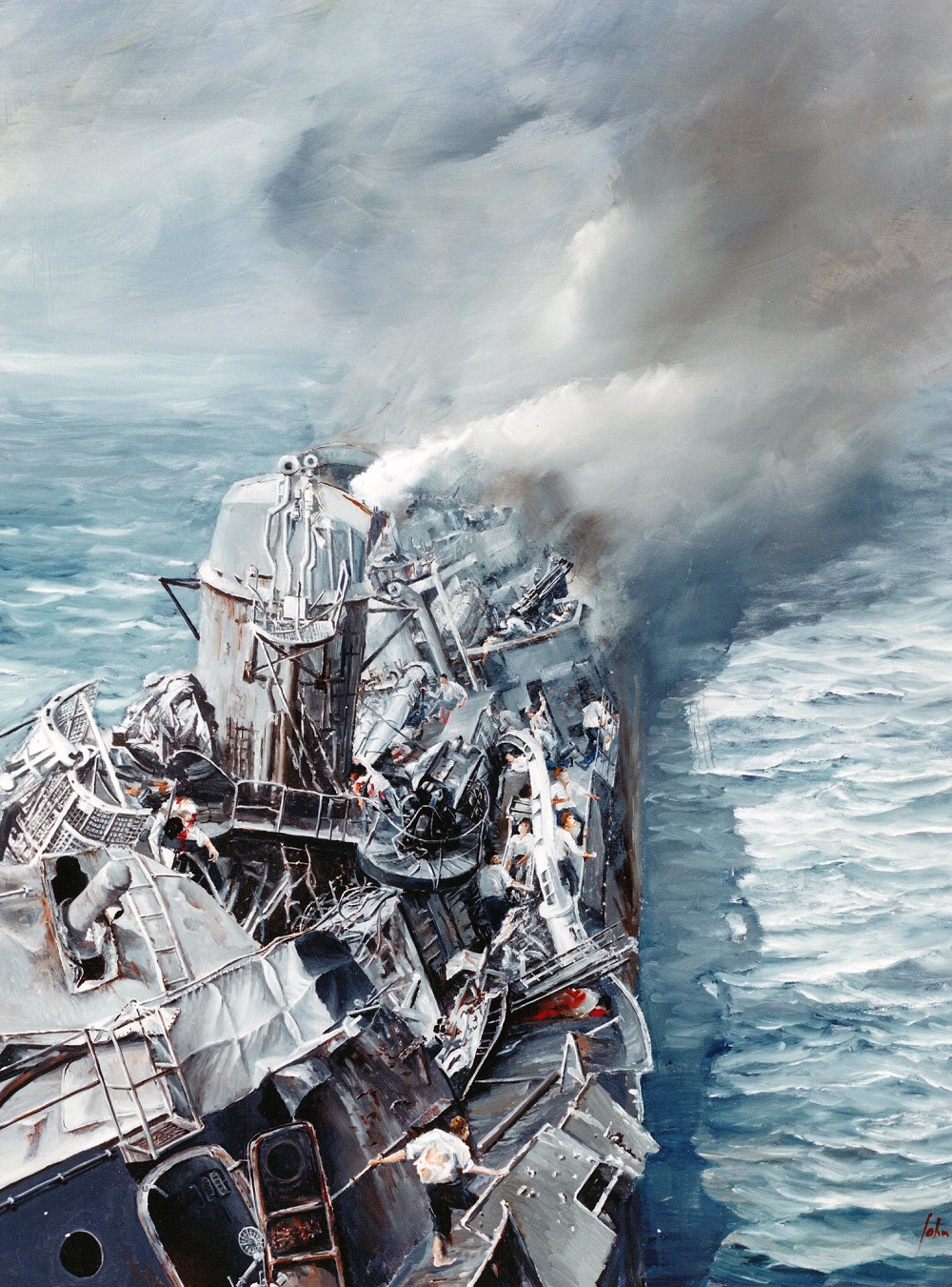Kamikaze attacks on USS Hazelwood (DD 531), shown battered but still afloat, April 29, 1945. Artwork by John Hamilton from his publication, “War at Sea,” pg. 256. Courtesy of the U.S. Navy Art Gallery, accession 88-66-K.