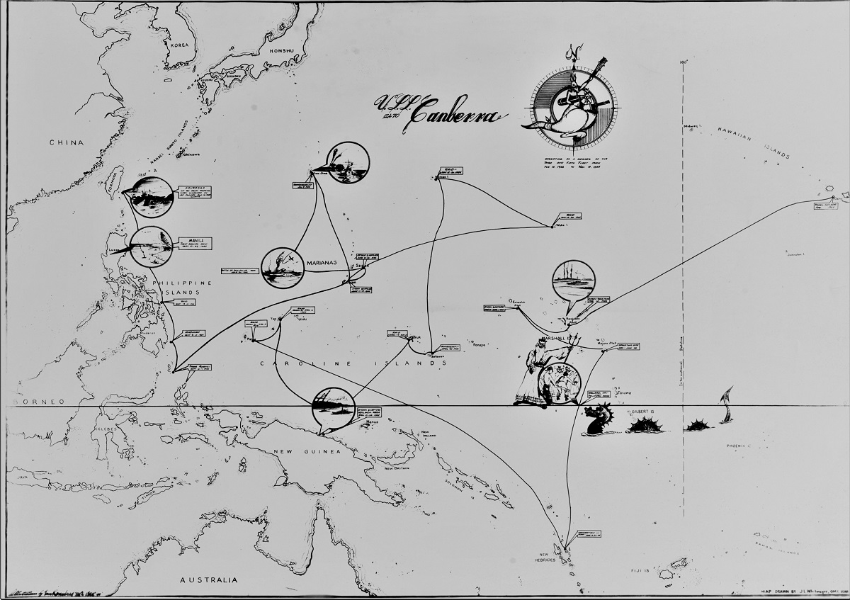 USS Canberra (CA-70), chart of the ship’s operations in the Pacific Ocean with the Fifth and Third Fleet, from 14 February to 19 November 1944. Drawn by Quartermaster J.L. Whitmeyer, USNR. NH 78680